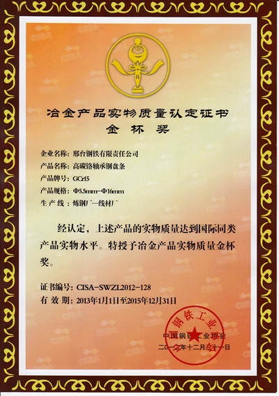 - recently, 133 products were awarded Golden Cup Prize of Metallurgic Products Quality of 2012 by China Iron and Steel Association since their quality achieved the same level of international similar products, and Xingtai Steel’s GCr15 Bearing Steel Wire Coils were included.