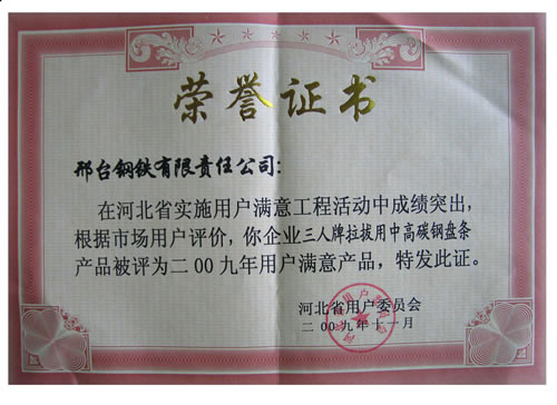 三人牌拉拔用中高碳鋼盤條被評(píng)為2009年河北省用戶滿意產(chǎn)品
