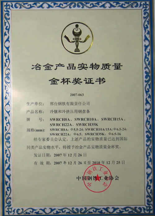 冷鐓和冷擠壓用鋼盤條SWRCH18A...SWRCH35K獲冶金產(chǎn)品實(shí)物質(zhì)量金杯獎(jiǎng)