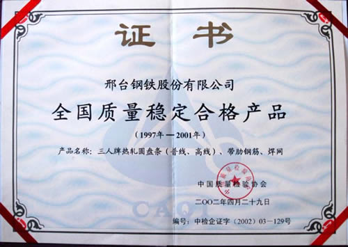 三人牌熱軋圓盤條、帶肋鋼筋、焊網(wǎng)獲全國質(zhì)量穩(wěn)定合格產(chǎn)品