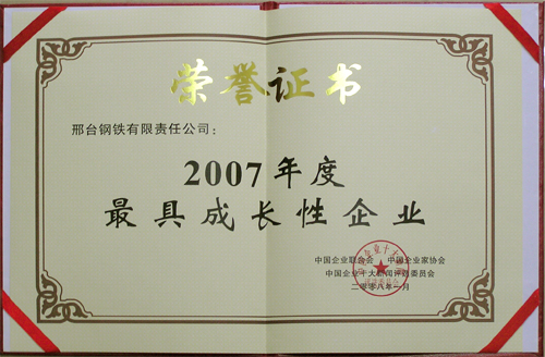 2008年1月,邢鋼榮獲由中國企業(yè)聯(lián)合會(huì)、中國企業(yè)家協(xié)會(huì)頒發(fā)的“2007年度最具成長性企業(yè)”榮譽(yù)稱號(hào)。