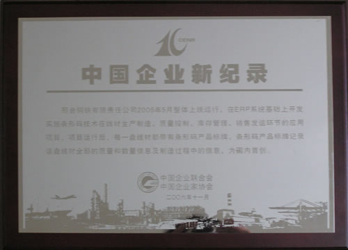 2006年11月,邢臺(tái)鋼鐵有限責(zé)任公司2005年整體上線運(yùn)行,在ERP系統(tǒng)基礎(chǔ)上開發(fā)實(shí)施條行碼技術(shù)在線材生產(chǎn)制造、質(zhì)量控制、庫存管理、銷售發(fā)運(yùn)環(huán)節(jié)的應(yīng)用項(xiàng)目,項(xiàng)目運(yùn)行后每一條線材都帶有條型碼產(chǎn)品標(biāo)牌,條型碼產(chǎn)品標(biāo)牌記錄該盤線材全部的質(zhì)量和數(shù)量信息及制造過程中的信息,為國內(nèi)首創(chuàng)。
