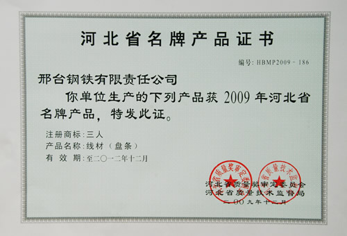 近日獲悉,2009年度邢鋼申報(bào)的“三人”牌線材產(chǎn)品,涵蓋冷墩鋼、簾線鋼、預(yù)應(yīng)力用鋼、優(yōu)質(zhì)碳素鋼、焊條用鋼、一般用低碳鋼、工業(yè)用純鐵、軸承鋼、彈簧鋼、機(jī)械結(jié)構(gòu)用鋼等十一個(gè)系列65個(gè)牌號線材產(chǎn)品榮獲“河北省名牌產(chǎn)品”。