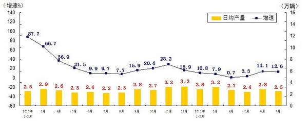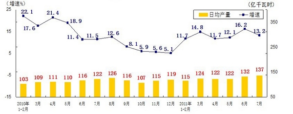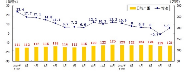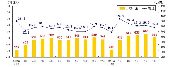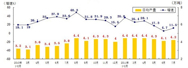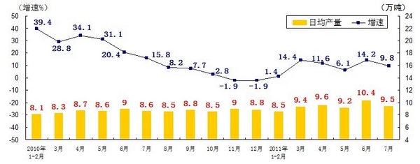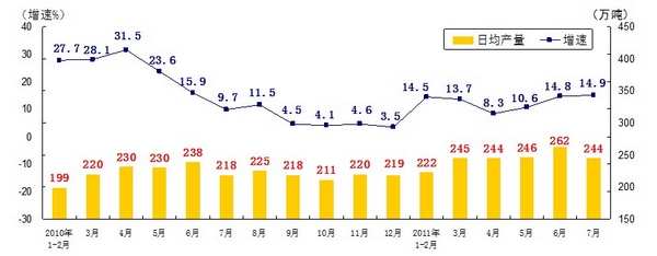 分產(chǎn)品看,7月份,468種產(chǎn)品中有381種產(chǎn)品同比增長(zhǎng)。其中,發(fā)電量4252億千瓦時(shí),日平均發(fā)電量137億千瓦時(shí),增長(zhǎng)13.2%;鋼材7572萬(wàn)噸,日平均產(chǎn)量244萬(wàn)噸,增長(zhǎng)14.9%;水泥18308萬(wàn)噸,日平均產(chǎn)量591萬(wàn)噸,增長(zhǎng)16.8%;原油加工量3749萬(wàn)噸,日平均產(chǎn)量121萬(wàn)噸,增長(zhǎng)5.9%;十種有色金屬293萬(wàn)噸,日平均產(chǎn)量9.5萬(wàn)噸,增長(zhǎng)9.8%;乙烯130萬(wàn)噸,日平均產(chǎn)量4.2萬(wàn)噸,增長(zhǎng)11.5%;汽車131.8萬(wàn)輛,日平均產(chǎn)量4.3萬(wàn)輛,下降1.3%;轎車77.7萬(wàn)輛,日平均產(chǎn)量2.5萬(wàn)輛,增長(zhǎng)12.6%。(參見附圖)