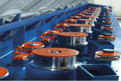 2、線材由放線機(jī)進(jìn)入拉絲機(jī)。經(jīng)過八次拉拔和八次卷筒冷卻,實(shí)現(xiàn)Φ4.9mm線材到Φ2.1mm線材的軋制。在最后一個卷筒后面,裝有一個舞臂單元,使拉絲機(jī)和收線機(jī)/收卷機(jī)保持同步。