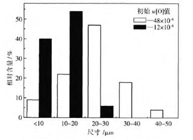 1600℃時,圖1中夾雜物尺寸分別為24μm和11.5μm。鋼中初始氧含量(質(zhì)量分數(shù))從48×10-6降低到12×10-6時,粒度為0-10μm和10-20μm夾雜物所占比例成倍增加,粒度為20-30μm夾雜物所占比例降低到5%左右,粒度大于30μm的夾雜物消失。降低鋼水鋁脫氧過程的初始氧含量可降低脫氧溶質(zhì)元素的過飽和度,從而增加鋼中小于20μm夾雜物的比例.