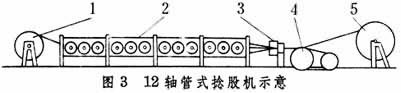 卷線:將鋼絲線盤,重新卷在捻股機(jī)的工字輪上;也可將鋼絲從拔絲機(jī)后直接卷到工字輪上;捻股:將鋼絲捻成繩股。捻股機(jī)有筐籃式、軸管式、無管式和雙捻機(jī)等。圖3為12軸管式捻股機(jī)示意圖,1是裝下層繩股的工字輪,2是旋轉(zhuǎn)的機(jī)筒,內(nèi)裝12個(gè)卷滿鋼絲的工字輪,3是成股的壓線瓦,4是牽引輪,5是上層繩股的收線輪,機(jī)筒旋轉(zhuǎn)一周,牽引輪引出的繩股長(zhǎng)度即為股的捻距。