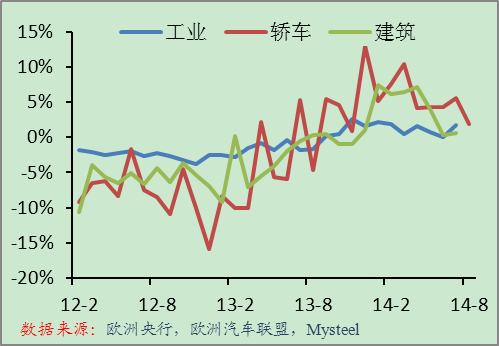 歐元區(qū)9月制造業(yè)PMI初值為50.5%,連續(xù)5個月環(huán)比下降,表明歐元區(qū)經濟增長依舊低迷,加之當前歐元區(qū)低通脹未見起色,預計經濟低增長可能在一段時間內為歐元區(qū)經濟的常態(tài)。目前歐洲央行采取逐步放寬政策的措施來改善歐元區(qū)信貸,但從當前來看,并沒有多大改善,預計歐洲央行將進一步放寬政策以挽救歐元區(qū)經濟。但即便如此,在財政改革遲緩的情況下,貨幣政策對于經濟的刺激效果不大。從歐洲下游行業(yè)的表現(xiàn)看,增長速度也是連續(xù)下滑。