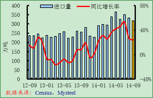 8月份美國鋼材進口量為333萬噸,同比增長27.4%,但環(huán)比下降5%。分品種看,與去年8月份相比,主要品種進口量均實現(xiàn)增長,依然是冷軋、鍍鋅板與中厚板的進口量增長最明顯,其中中厚板增長114%,冷軋增長65.7%,鍍鋅板增長46.1%。與今年7月份比,除半成品、長材、線材和螺紋鋼進口量環(huán)比增長外,其他品種均環(huán)比下降,其中螺紋鋼增長最快,為191.5%。最新的統(tǒng)計數(shù)據顯示,截至到2014年9月24日,9月份美國鋼材進口許可證數(shù)為317萬噸,高于去年9月水平,與8月份同期數(shù)據基本持平,預計今年9月份美國鋼材進口量同比仍將大幅增加,環(huán)比基本持平或略有增長。