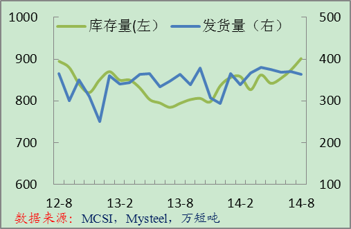 8月末美國金屬服務中心的鋼材庫存達到901.4萬短噸,環(huán)比增長3.1%,同比增長13.5%,創(chuàng)兩年來最高水平。8月份美國服務中心的發(fā)貨量為364萬短噸,同比略微增長,環(huán)比下降1.7%。按照供應天數(shù)計算,8月末的鋼材庫存為2.5個月供應量,7月末為2.4個月供應量。2013年8月末為2.2個月供應量。