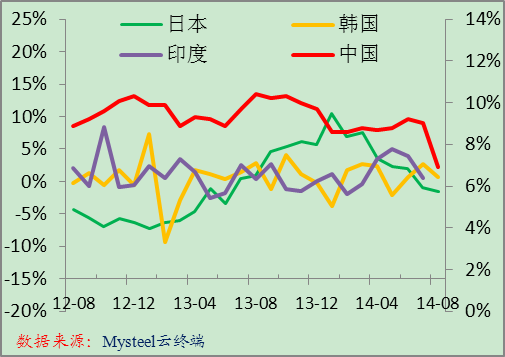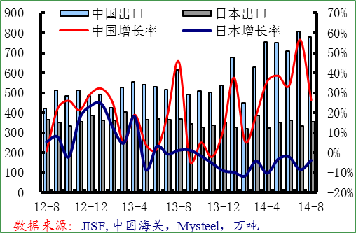 8月份中國鋼材出口778萬噸,同比增長26.4%,環(huán)比下降3.7%。9月份中國鋼材市場大幅下滑,鋼材出口進一步增強,PMI調查也顯示出口訂單增長,預計9月份中國鋼材出口依然保持在高水平。8月日本鋼鐵出口量為356萬噸,同比下降3.8%,環(huán)比增長6.7%,主要是日元貶值帶動。9月份日元大幅貶值,日本鋼材出口競爭力再次加強,預計出口量將繼續(xù)環(huán)比增長。