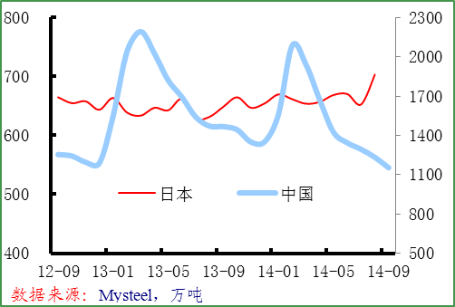 9月份中國流通環(huán)節(jié)鋼材庫存繼續(xù)下降,9月底全國主要鋼的社會庫存為1154萬噸,比8月底下降80萬噸,較去年同期下降314萬噸,鋼廠價格大幅下滑,貿易商加大了去庫存力度。中鋼協(xié)統(tǒng)計數(shù)據顯示,9月中旬末重點鋼企鋼材庫存為1590萬噸,較8月中旬末增長65萬噸,全國重點鋼廠鋼廠庫存連續(xù)兩個月增長。日本國內庫存大幅上升,8月末全國鋼材庫存為703萬噸,創(chuàng)10年來最高水平,鋼廠庫存增長明顯,市場需求難以消化供應。