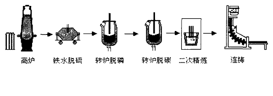轉(zhuǎn)爐雙聯(lián)法冶煉工藝核心技術(shù)為轉(zhuǎn)爐法鐵水脫磷、轉(zhuǎn)爐頂?shù)讖?fù)吹和少渣冶煉技術(shù)。
