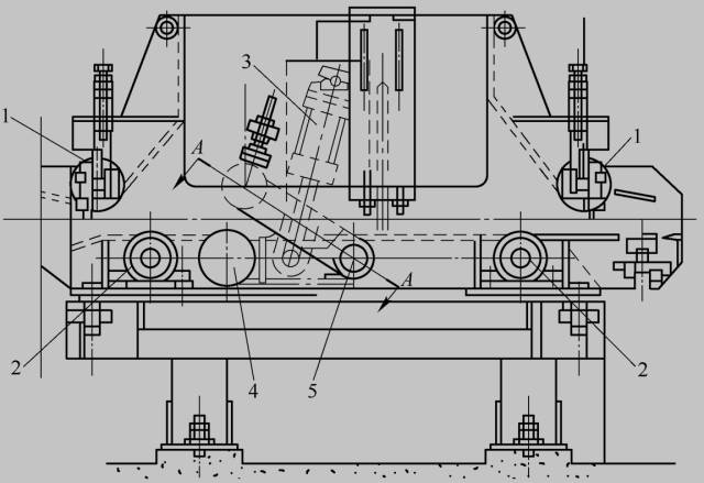 l-導(dǎo)輥;2-輥道;3-氣缸;4-活套輥;5-轉(zhuǎn)軸