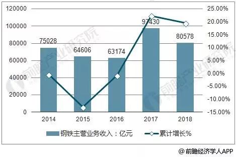 據(jù)前瞻產(chǎn)業(yè)研究院發(fā)布的《中國鋼鐵行業(yè)發(fā)展前景與投資戰(zhàn)略規(guī)劃分析報告》指出,2018上半年中國鋼鐵行業(yè)主營業(yè)務(wù)收入達到30525億元,累計增長15.8%。回顧2012-2017年鋼鐵行業(yè)營業(yè)收入情況:近六年來,我國鋼行業(yè)營業(yè)收入較為穩(wěn)定,2015年以來累計增長率逐漸回暖。中國鋼鐵行業(yè)將繼續(xù)保持穩(wěn)中有長趨勢,預(yù)計2018年中國鋼鐵行業(yè)營收將突破80000億元。