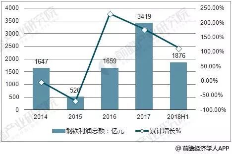 近年來,鋼鐵行業(yè)盈利能力持續(xù)穩(wěn)定增長,2017年鋼鐵行業(yè)利潤總額達到3419億元,與2016年相比增長率高達177.8%;2018上半年行業(yè)利潤達到1876億元,增長率為113%,鋼鐵行業(yè)利潤的整體向好。