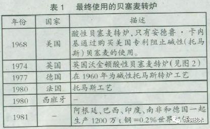 在世界的一些地區(qū)氧氣轉(zhuǎn)爐煉鋼和貝塞麥轉(zhuǎn)爐一直共存至1981年,但是在歐洲止于19世紀70年代,使用情況見表1。