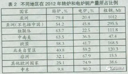 雖然電弧爐煉鋼產(chǎn)量沒有超過全球粗鋼總產(chǎn)量的三分之一(在2012年占29.3%),但由于中國在世界鋼產(chǎn)量的主導(dǎo)地位(占世界總量的46%),且它主要使用氧氣煉鋼,電弧爐煉鋼的影響被忽略,表2顯示了在2012年不同地區(qū)轉(zhuǎn)爐煉鋼及電弧爐煉鋼的相對比例。