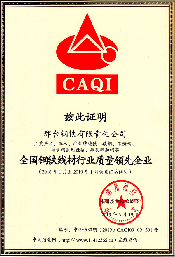 In early 2019, Xingtai Steel participated in a theme activity focusing on the product quality and service commitment organized by China Association for Quality Inspection. Recently, Xingtai Steel was awarded the title of "Leading Enterprise of High-Quality Steel in National Steel Wire Industry" and "National Product and Service Quality Integrity Model Enterprises" by China Association for Quality Inspection. The main products including pure iron, carbon steel, stainless steel, wire rod for bearing and hot rolled ribbed steel bar of Three Person Brand were awarded the title of “Products with Excellent Quality Stability in China”.