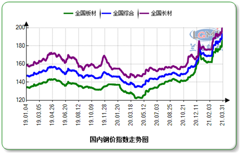 一季度,在需求提振、成本支撐、環(huán)保加碼、國內(nèi)外大宗商品整體上漲帶動(dòng)下,國內(nèi)鋼鐵市場震蕩上行,據(jù)蘭格鋼鐵云商平臺(tái)監(jiān)測數(shù)據(jù)顯示,一季度,蘭格鋼鐵綜合鋼材價(jià)格指數(shù)均值為177,同比上升22.5%;長材價(jià)格指數(shù)為184.2,同比上升22.5%;板材價(jià)格指數(shù)為169.7,同比上升29.0%。從鋼材均價(jià)來看,一季度蘭格鋼鐵綜合鋼材均價(jià)為4868元/噸,較上年同期上漲同比上漲977元/噸,同比上漲25.1%。