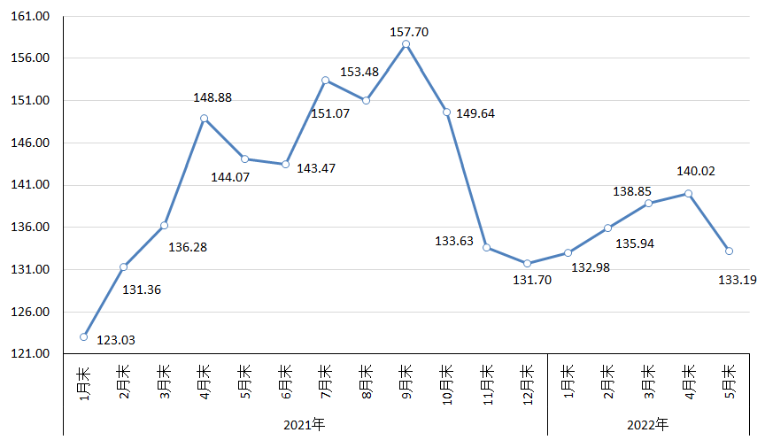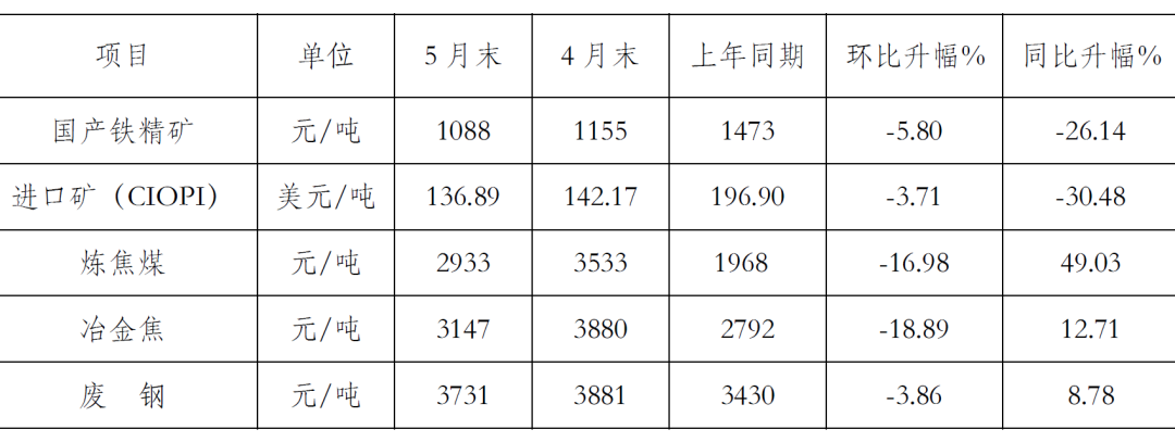 5月末,CIOPI進(jìn)口礦價(jià)格環(huán)比下降5.28美元/噸,國產(chǎn)鐵精礦價(jià)格環(huán)比下降67元/噸;煉焦煤價(jià)格環(huán)比下降600元/噸,冶金焦價(jià)格環(huán)比下降733元/噸,廢鋼價(jià)格環(huán)比下降150元/噸。原燃料價(jià)格雖環(huán)比回落,但總體仍處于高位。(見下表)