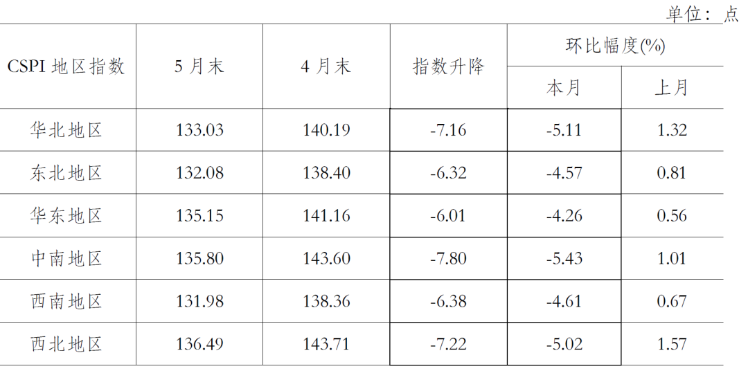 5月份,CSPI全國六大地區(qū)鋼材價(jià)格指數(shù)均由升轉(zhuǎn)降。其中中南地區(qū)降幅較大,環(huán)比下降5.43%;華東地區(qū)降幅較小,環(huán)比下降4.26%;華北、東北、西南和西北地區(qū)鋼價(jià)指數(shù)環(huán)比分別下降5.11%、4.57%、4.61%和5.02%。(見下表)