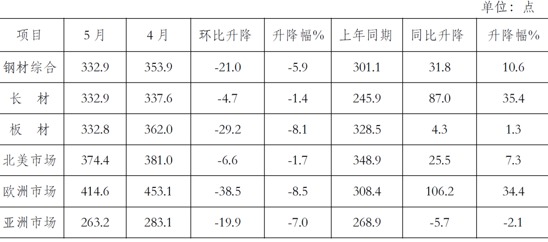 5月份,CRU國際鋼材價(jià)格指數(shù)為332.9點(diǎn),環(huán)比下降21.0點(diǎn),降幅為5.9%;同比上升31.8點(diǎn),升幅為10.6%。(見下圖)