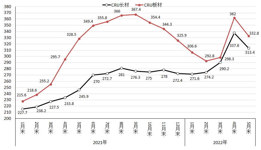 5月份,CRU長材指數(shù)為313.4點(diǎn),環(huán)比下降4.7點(diǎn),降幅為1.4%;CRU板材指數(shù)為332.8點(diǎn),環(huán)比下降29.2點(diǎn),降幅為8.1%,比長材降幅高2.2個(gè)百分點(diǎn);與去年同期相比,CRU長材指數(shù)同比上升87.0點(diǎn),升幅為35.4%;CRU板材指數(shù)同比上升4.3點(diǎn),升幅為1.3%。(見下圖)