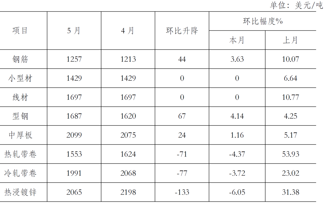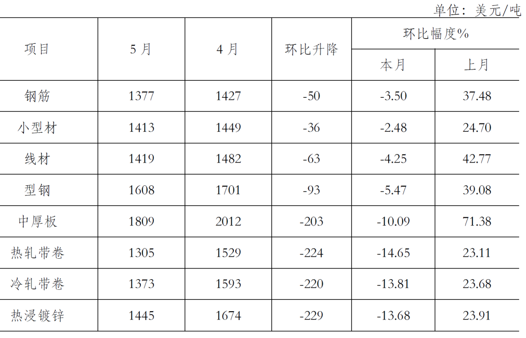 5月份,鋼鐵產(chǎn)量持續(xù)環(huán)比增長。吉林,上海等疫情嚴(yán)重地區(qū)開始復(fù)工復(fù)產(chǎn)、國家穩(wěn)增長政策相繼出臺,對需求的拉動(dòng)還不明顯,國內(nèi)市場鋼材需求增長不及預(yù)期,加上鋼鐵生產(chǎn)環(huán)比增長,以及原燃材料價(jià)格在前期大漲后有所回落,致使鋼材價(jià)格呈小幅下行走勢。