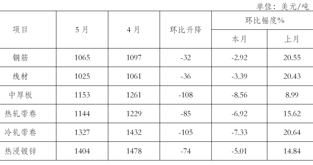 5月末,鋼鐵協(xié)會監(jiān)測的八大鋼材品種價(jià)格均有所下降。其中,熱軋卷板和冷軋薄板繼續(xù)下降,且降幅較上月有所加大,環(huán)比分別下降302元/噸和196元/噸;高線、三級鋼筋、角鋼、中厚板、鍍鋅板和熱軋無縫管價(jià)格由升轉(zhuǎn)降,環(huán)比分別下降272元/噸、298元/噸、188元/噸、154元/噸、162元/噸和91元/噸。(見下表)