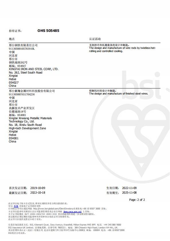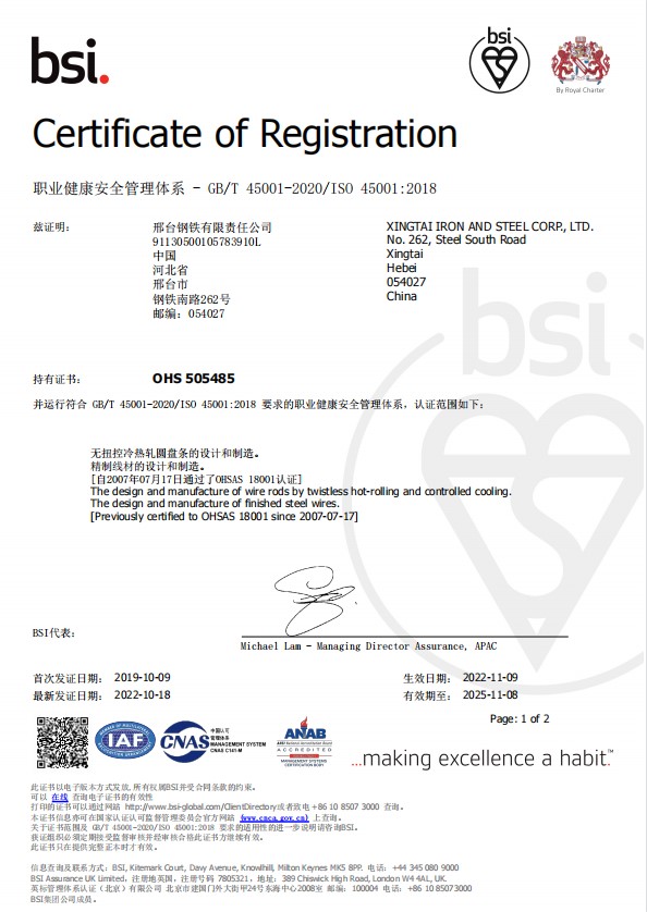 In order to carry out the concept of continuous improvement and continuously strengthen the safety and environmental protection, from 22nd to 26th in August, 8 experts from BSI (British Standards Institute) were invited to conduct a 5-day audit on the operation of Occupational Health and Safety Management System (ISO45001:2018) and Environmental Management System (ISO14001:2015). The audit team gave full affirmation and high evaluation to our progress on the work of occupational health and environmental protection, and also put forward guidance and suggestions for improvement. For the problems in operating system, the relevant departments will analyze the root causes, make a corrective action plan and learn by analogy to achieve the continuous improvement of the safety and environmental system, which is highly praised by the experts. As expected, Xingtai Steel successfully passed the certification of Safety and Environment System issued by BSI. Until now, Xingtai Steel has passed the certification of Safety and Environment System issued by BSI for 16 consecutive years.