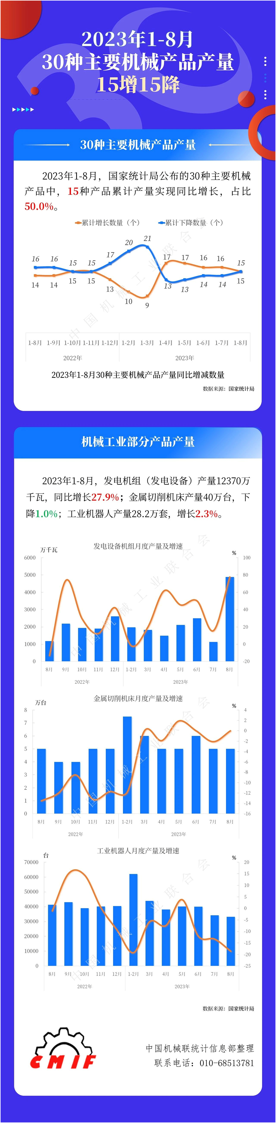 2023年1-8月,發(fā)電機組(發(fā)電設(shè)備)產(chǎn)量12370萬千瓦,同比增長27.9%;金屬切削機床產(chǎn)量40萬臺,下降1.0%;工業(yè)機器人產(chǎn)量28.2萬套,增長2.3%。