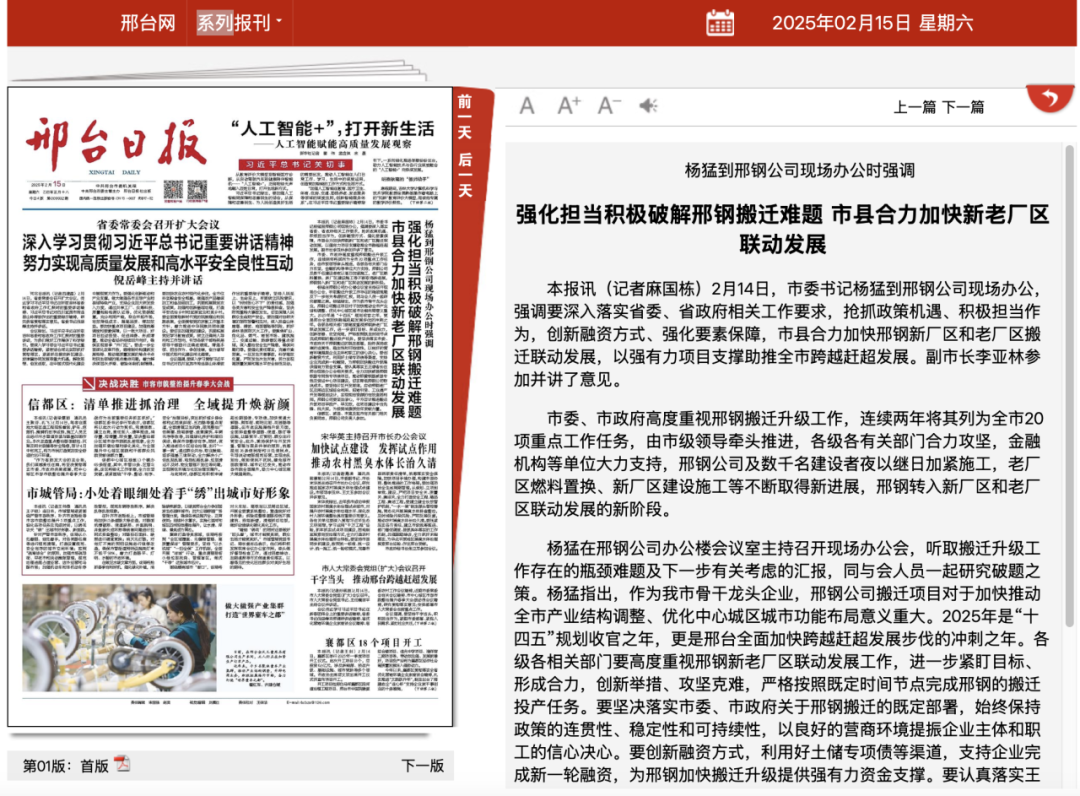2月14日,市委書(shū)記楊猛到邢鋼公司現(xiàn)場(chǎng)辦公,強(qiáng)調(diào)要深入落實(shí)省委、省政府相關(guān)工作要求,搶抓政策機(jī)遇、積極擔(dān)當(dāng)作為,創(chuàng)新融資方式、強(qiáng)化要素保障,市縣合力加快邢鋼新廠區(qū)和老廠區(qū)搬遷聯(lián)動(dòng)發(fā)展,以強(qiáng)有力項(xiàng)目支撐助推全市跨越趕超發(fā)展。副市長(zhǎng)李亞林參加并講了意見(jiàn)。