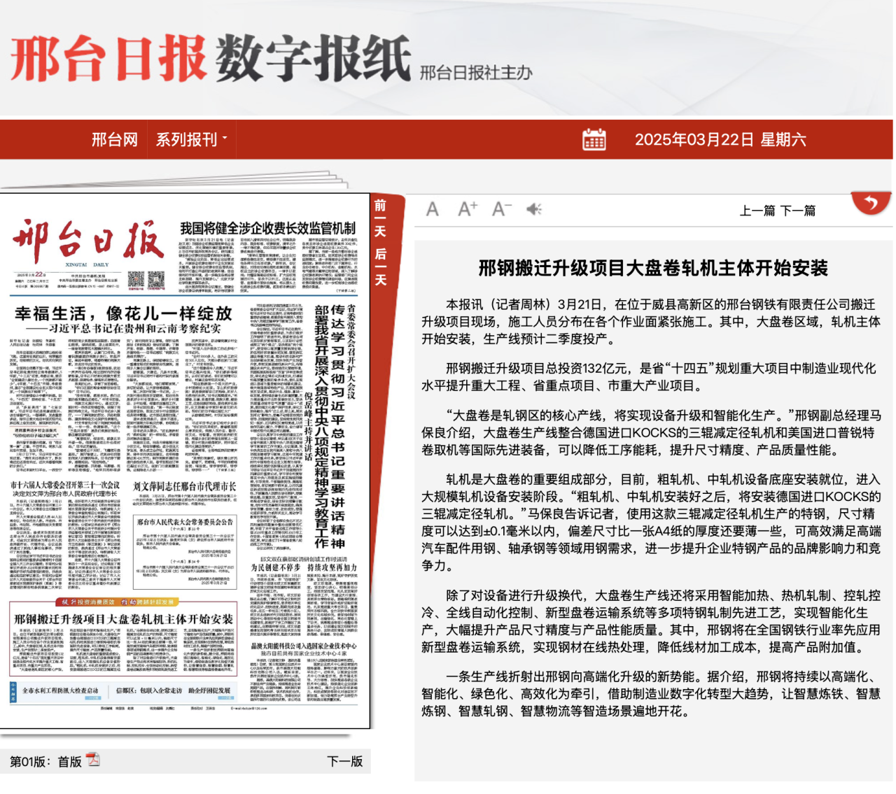 3月21日,在位于威縣高新區(qū)的邢臺鋼鐵有限責(zé)任公司搬遷升級項目現(xiàn)場,施工人員分布在各個作業(yè)面緊張施工。其中,大盤卷區(qū)域,軋機主體開始安裝,生產(chǎn)線預(yù)計二季度投產(chǎn)。